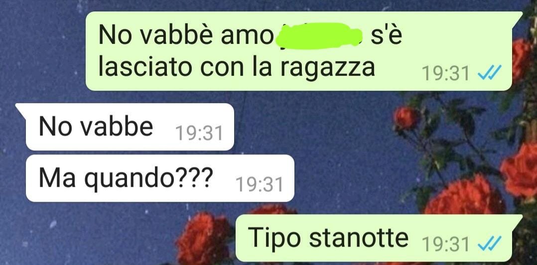 O quando il docente pubblica il voto dell’esame che temevate di più ed è un miracoloso 19, quindi scrivete subito all’amica: “no vabbè, 19 e tu?” e lei se è andato bene risponderà “18, no vabbè”, se andata male dirà semplicemente “no vabbè, m’ha bocciata!” (che poi non c’era tanto da stupirsi). Quando la vostra amica è al telefono con il suo ragazzo, le arriva un vostro messaggio e vi risponde “stavo parlando di te con lui e mi hai scritto” e voi rispondete “no vabbè, e che dicevi? E perché parlavi proprio di me e non di Gesualda?” e lei: “no vabbè, ancora non l’hai capito che sei la mia preferita?!”.